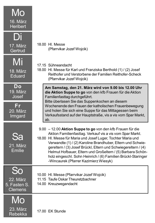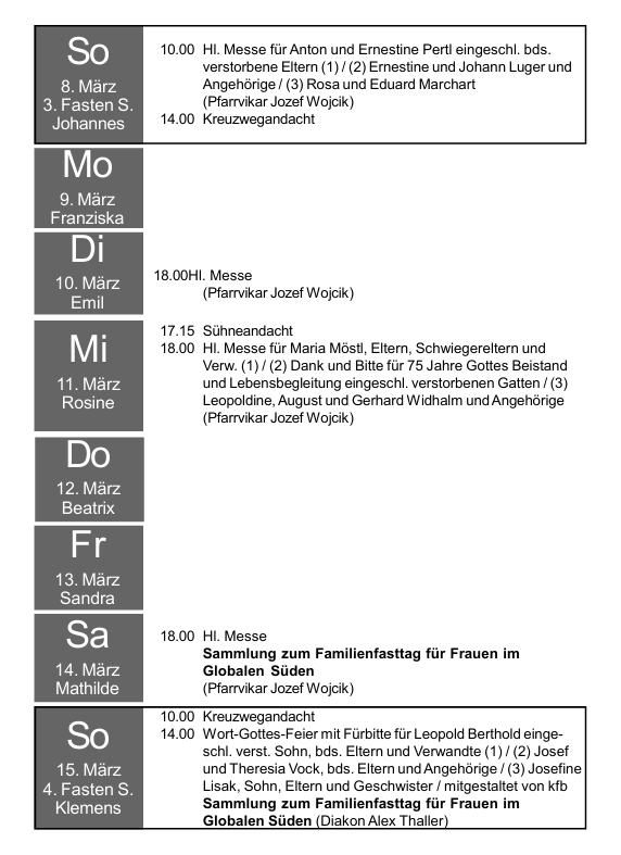 Ab 1. September 2025 findendie Samstag Vorabend Gottesdienstewieder um 18.00 Uhr stattDie Wochentagsmessenbleiben wie gehabt ebenfalls bei 18.00 Uhr!